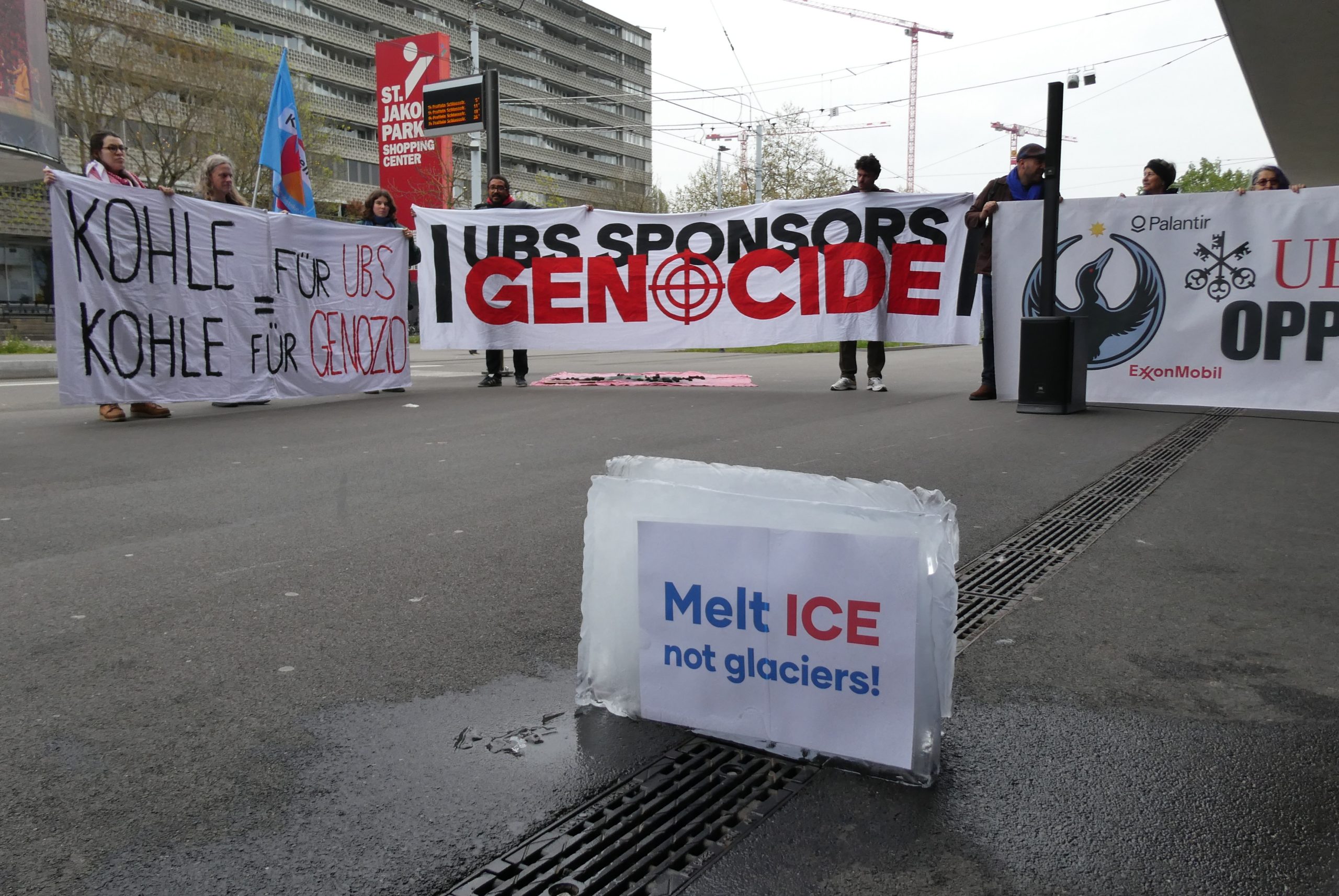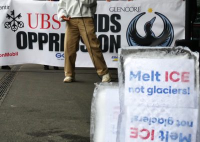 “UBS is profiting off of our suffering and the destruction of our communities in the United States by investing in ICE contractors (Palantir, CoreCivic, Geo Group, CACI International). We demand that they divest and instead invest in supporting the migrant community in Switzerland.”