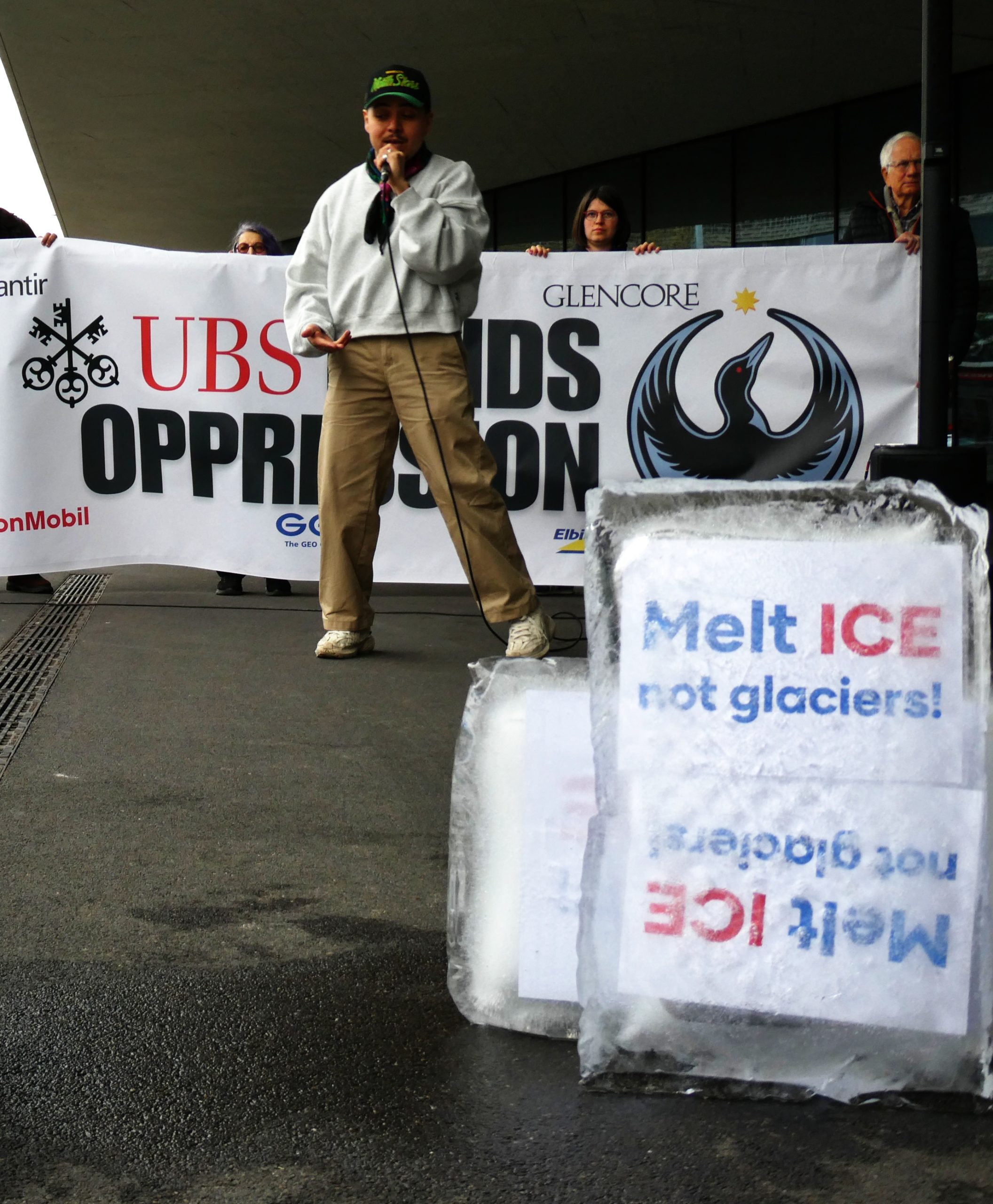 Speakers at the protest included delegates Rafael Gonzalez (Tufawon), a hip-hop Dakota/Boricua artist from Minnesota and Janette Zahia Corcelius, a member of the Democrats Socialists of America— alongside delegates and presentatives from BDS, Urgewald, BreakFree Suisse, Climate Strike and Collective Climate Justice who emphasized the urgent need for UBS to align its investments with human rights, climate justice, and democratic values.