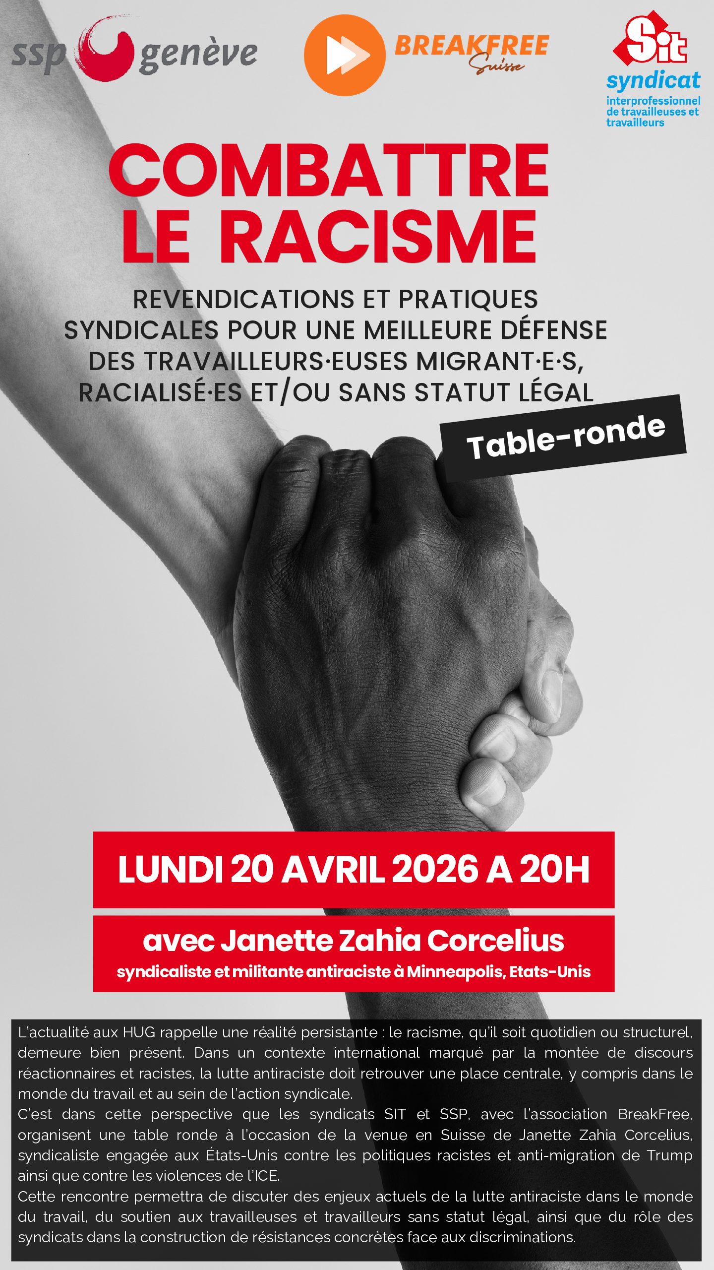 C’est dans cette perspective que les syndicats SIT et SSP, avec l’association BreakFree, organisent une table ronde à l’occasion de la venue en Suisse de Janette Zahia Corcelius, syndicaliste engagée aux États-Unis contre les politiques racistes et anti-migration de Trump ainsi que contre les violences de l’ICE.