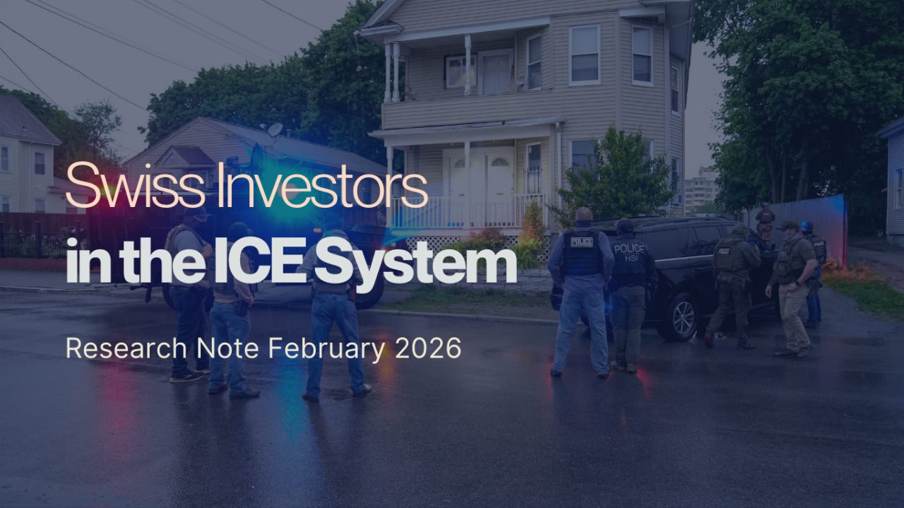 We are publishing, under a Creative Commons license, a Research Note that brings together, for the first time, investment data from seven leading Swiss financial players in four US “allies and assets” companies and key ICE service providers: Palantir, AT&T, Geo Group, and CoreCivic.